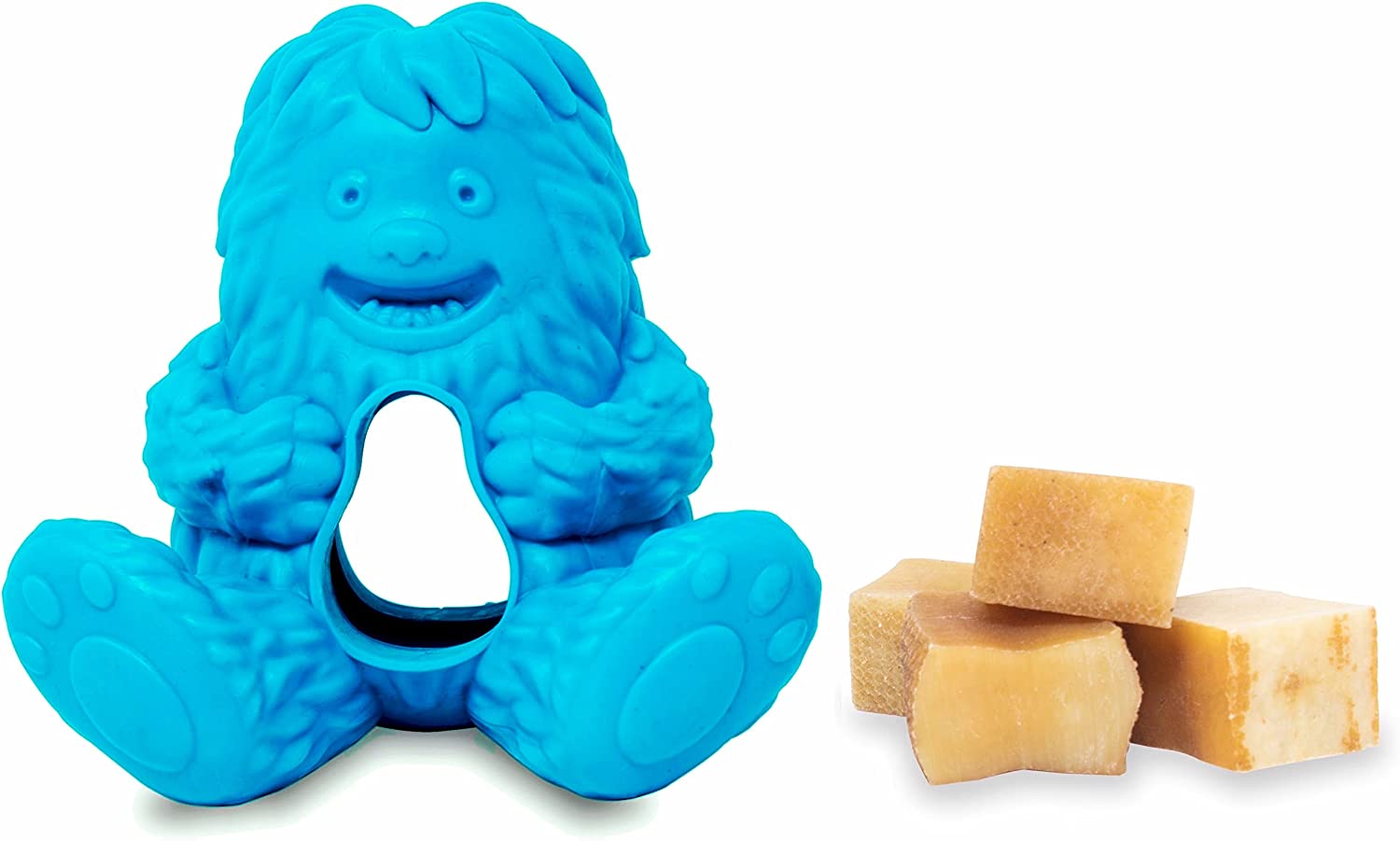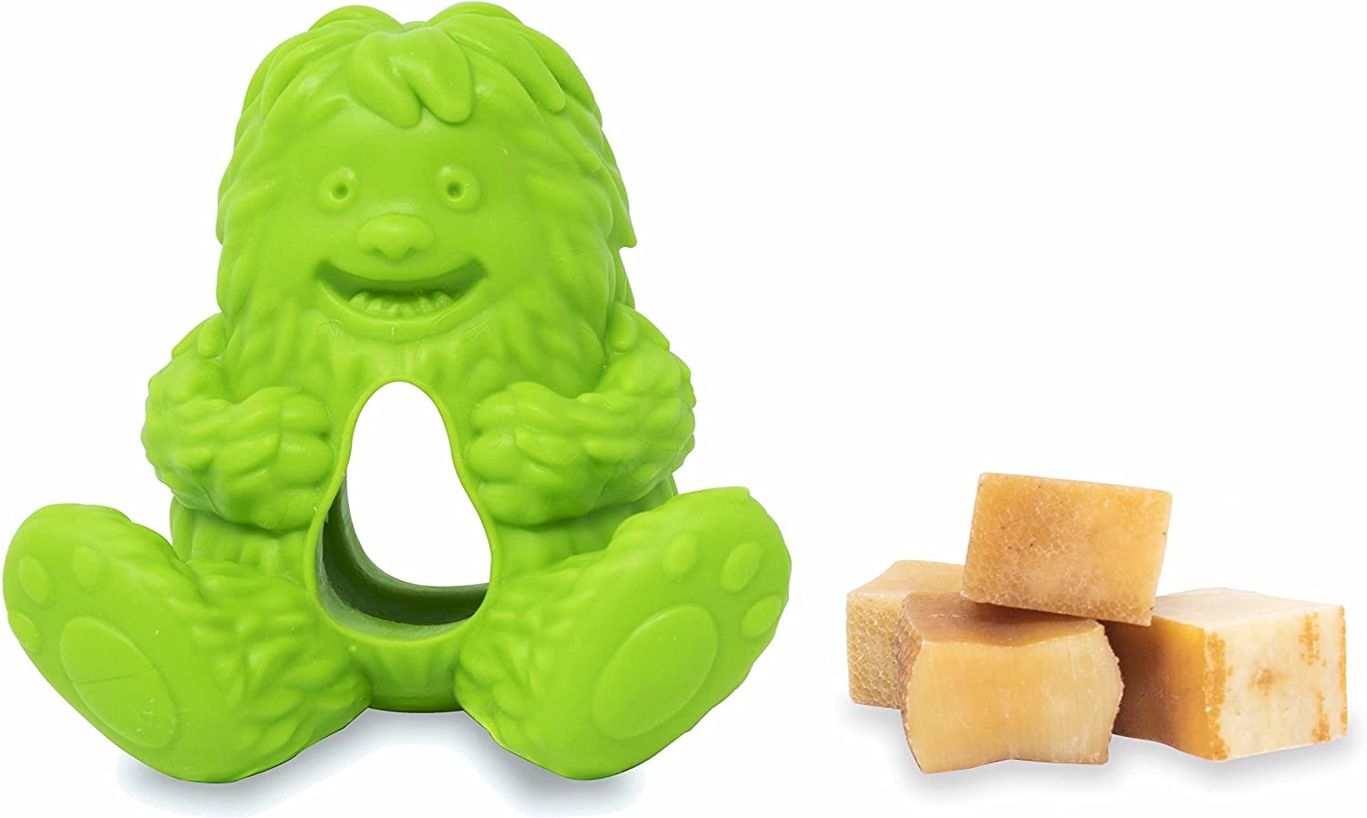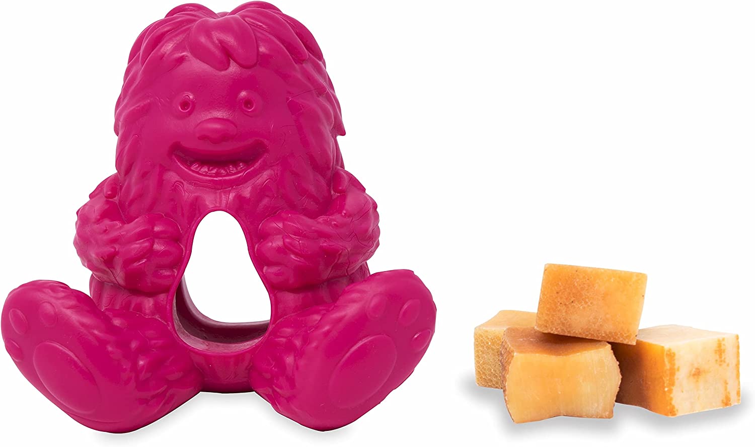 A long lasting chew treat dispensing toy for light and moderate chewers. It comes in three different colors: Pink, Green and Blue. It is microwave and dishwasher safe and works well with all natural Yeti Nuggets.