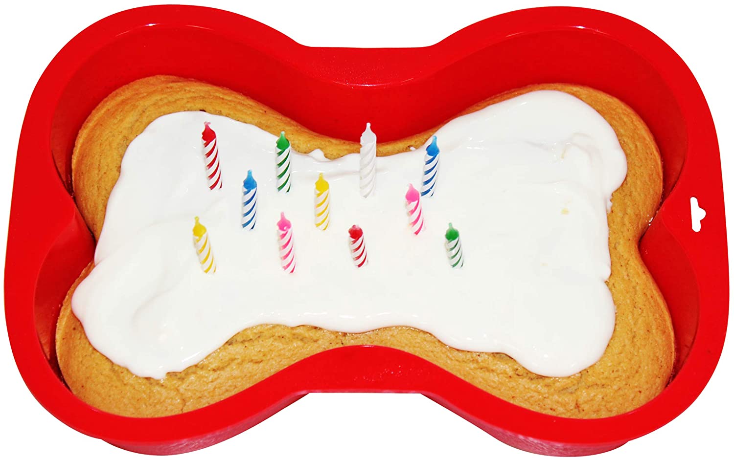 Dog Bone Silicone Cake Pan Makes one bone shaped cake, use one box of Puppy Cake or two boxes for a taller cake. Made of commercial grade silicone. Dishwasher and microwave safe. Perfect for any occasion. (7″ x 10″ x 2″)