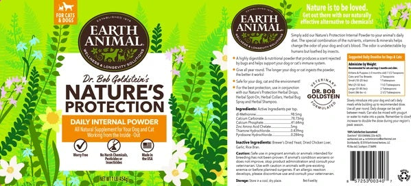 By simply adding the Internal Powder to your animal’s daily diet, the combination of the nutrients, vitamins and minerals can help change your dog or cat’s odor so that fleas, ticks, mosquitoes and insects dislike the scent or taste of the blood. Undetectable by humans yet, loathed by bugs. Given internally, all year round, the longer the dog or cat ingests the powder the better it works! We suggest adding our Herbal Drops and using our collars, spot-on, shampoo and spray for extra protection.
