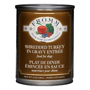 By Fromm. A generous portion of shredded turkey cooked in turkey broth with potatoes, carrots, and beans Ingredients Turkey Broth, Turkey, Potatoes, Carrots, Green Beans, Peas, Pinto Beans, Kidney Beans, White Beans, Salmon Oil, Tomato Paste, Minerals, Xanthan Gum, Salt, Potassium Chloride, Vitamins.